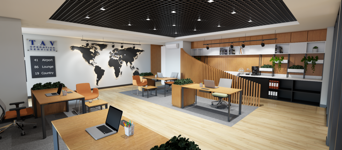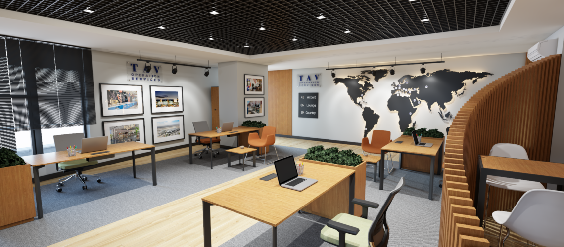 Tav İşletme Hizmetleri’nin talebi doğrultusunda Kenya Nairobi Havalimanı Merkez Ofisleri olarak firmamız tarafından tasarlanan proje 130m² alanda modern ofis gereksinimlerini kapsayan bir proje. Konsept tasarımları ile beraber uygulama projelerini de üstlendiğimiz projede açık kapalı çalışma ortamları çalışanların konforu gözetilerek kurgulandı. Bölgeye özgü gelenekler modern bir çizgide mekana uyarlandı.