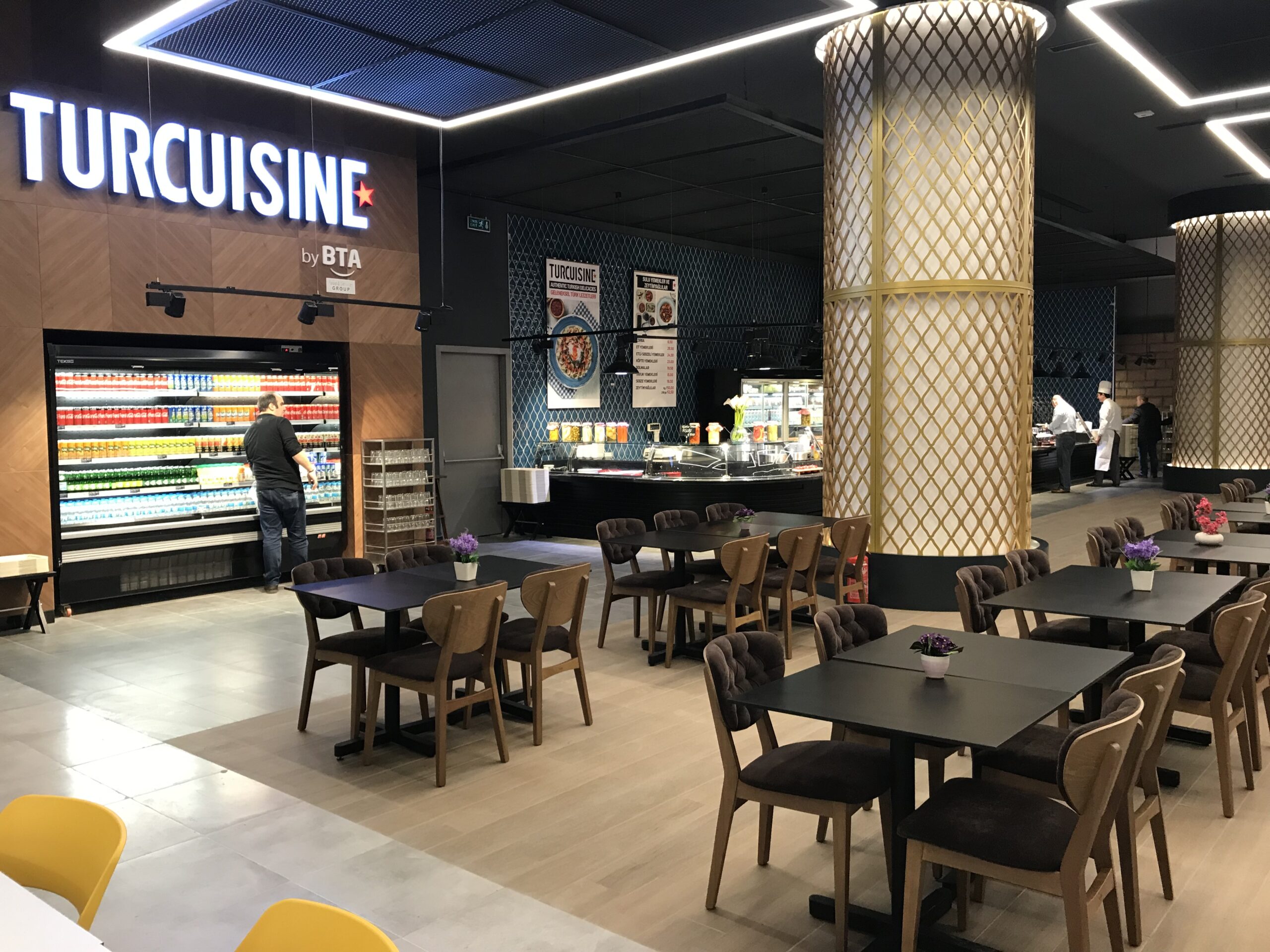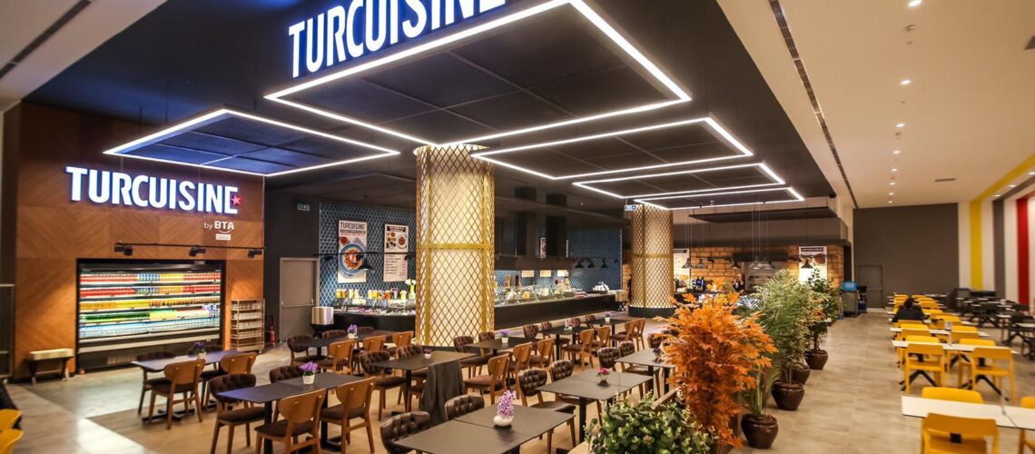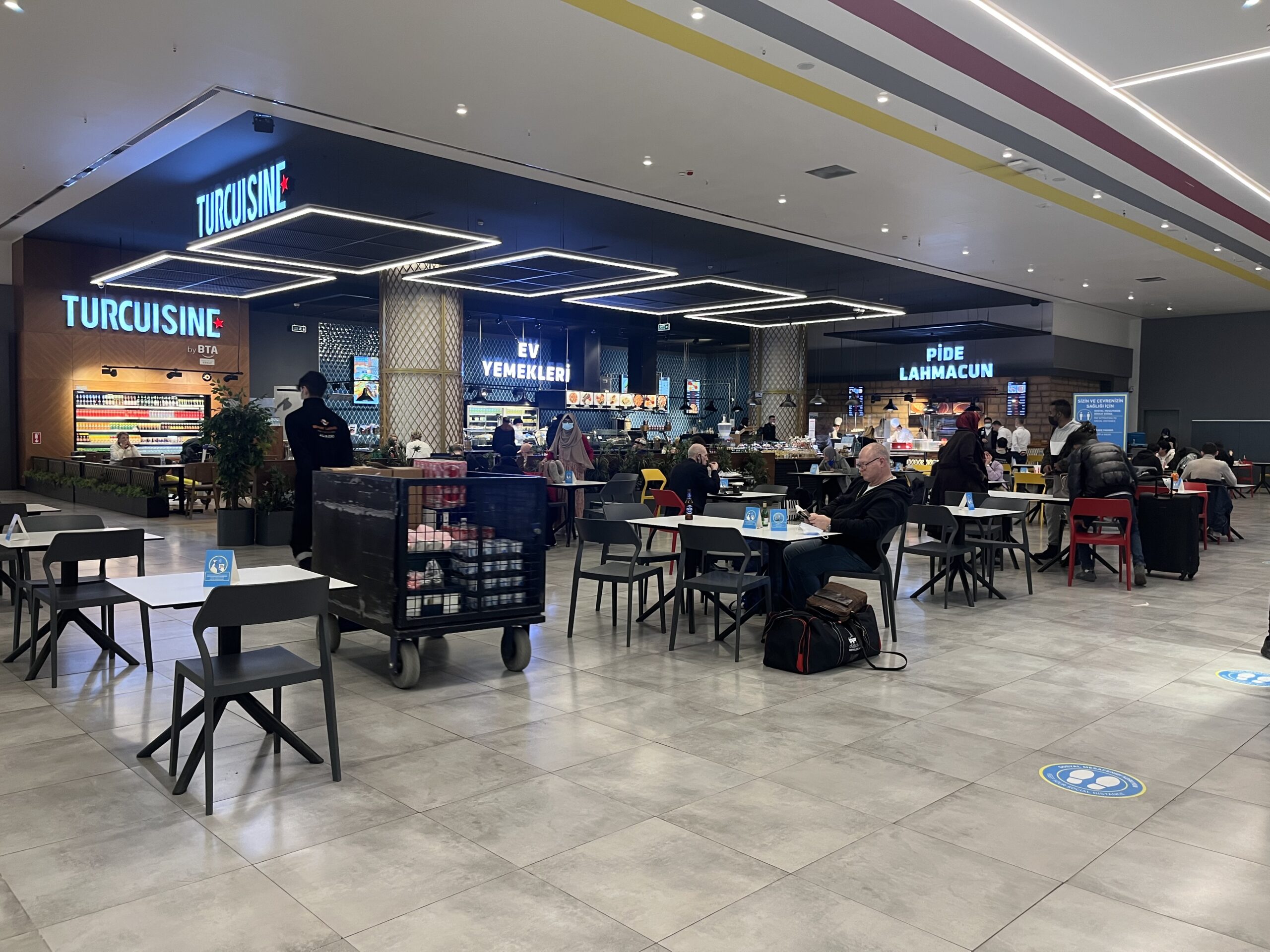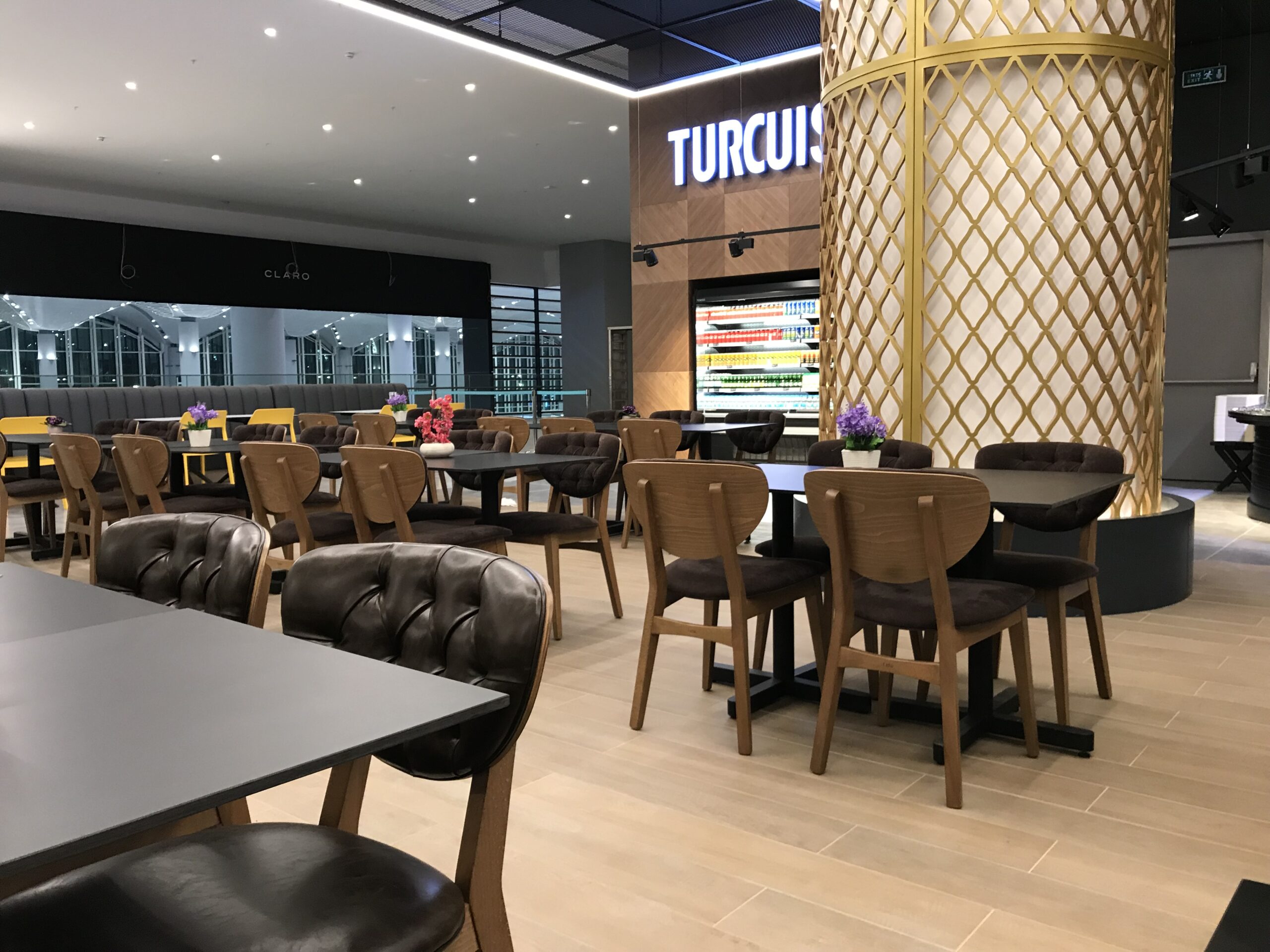 2018 yılında İstanbul Havalimanı’nda uygulamasını yaptığımız geleneksel Türk mimarisinden ilham alınarak tasarlanan Turcuisine, havalimanının giriş terminalindeki asma katta yer alıyor. İşlemeli kolon kaplamaları, ahşap duvar uygulamaları, tavan panelleri ve yemek bankosu mekanın ana tasarım ögeleri.