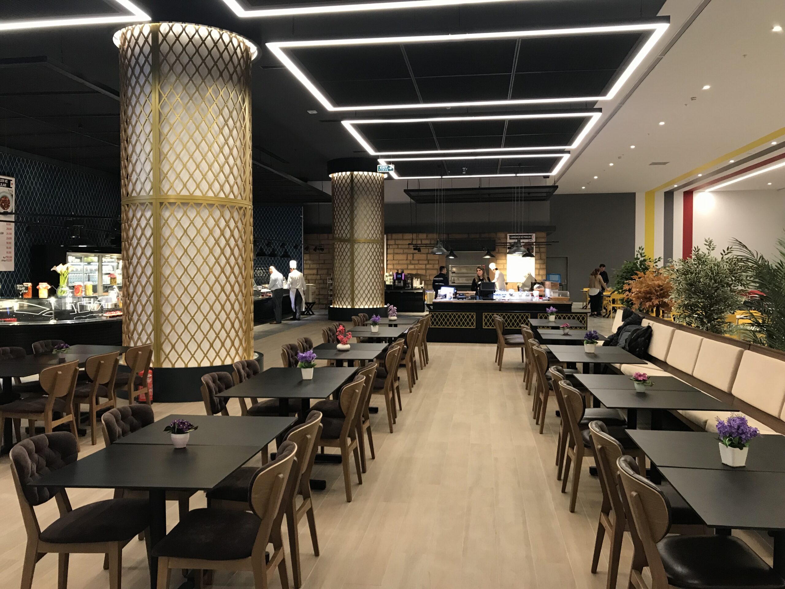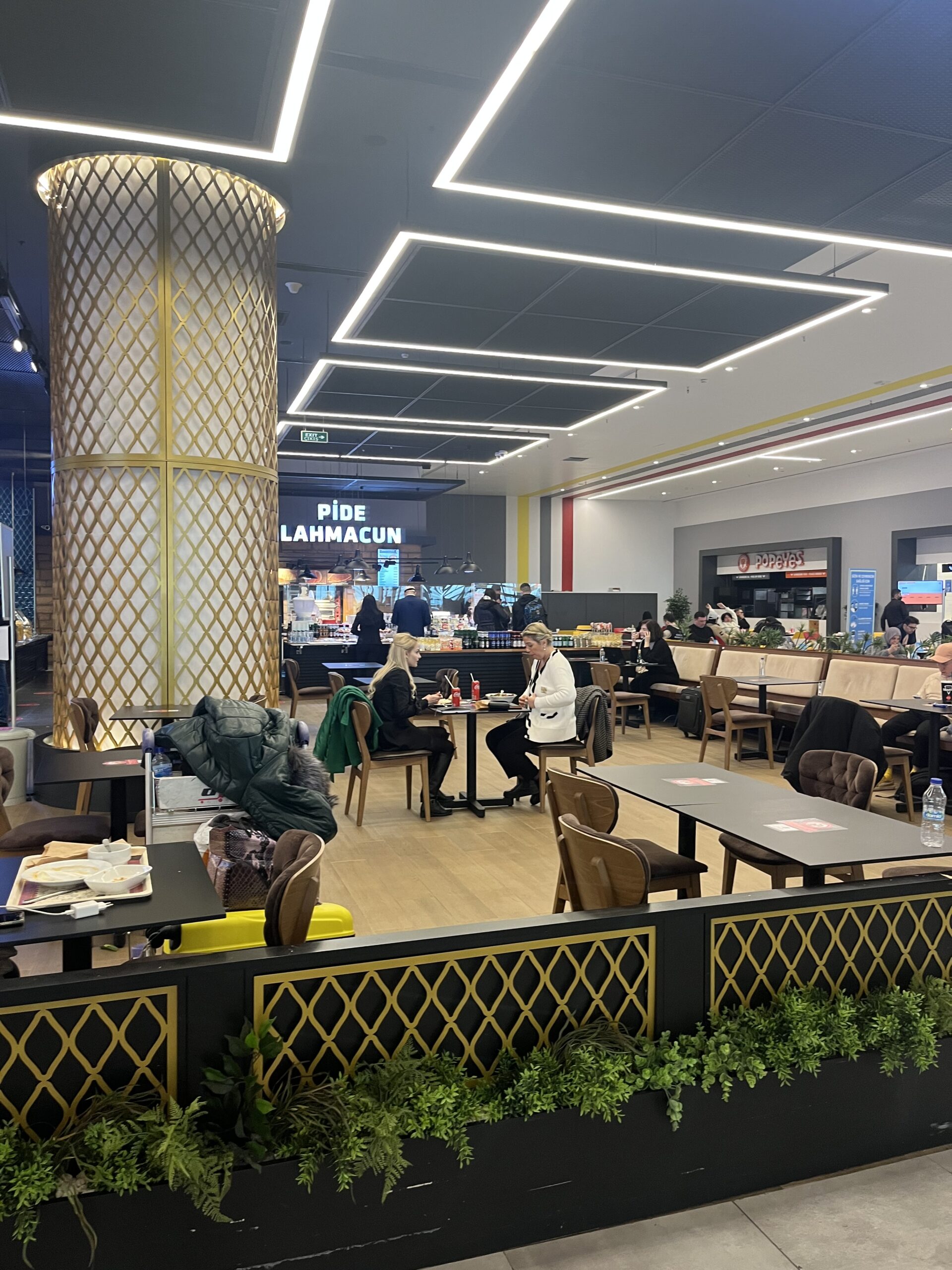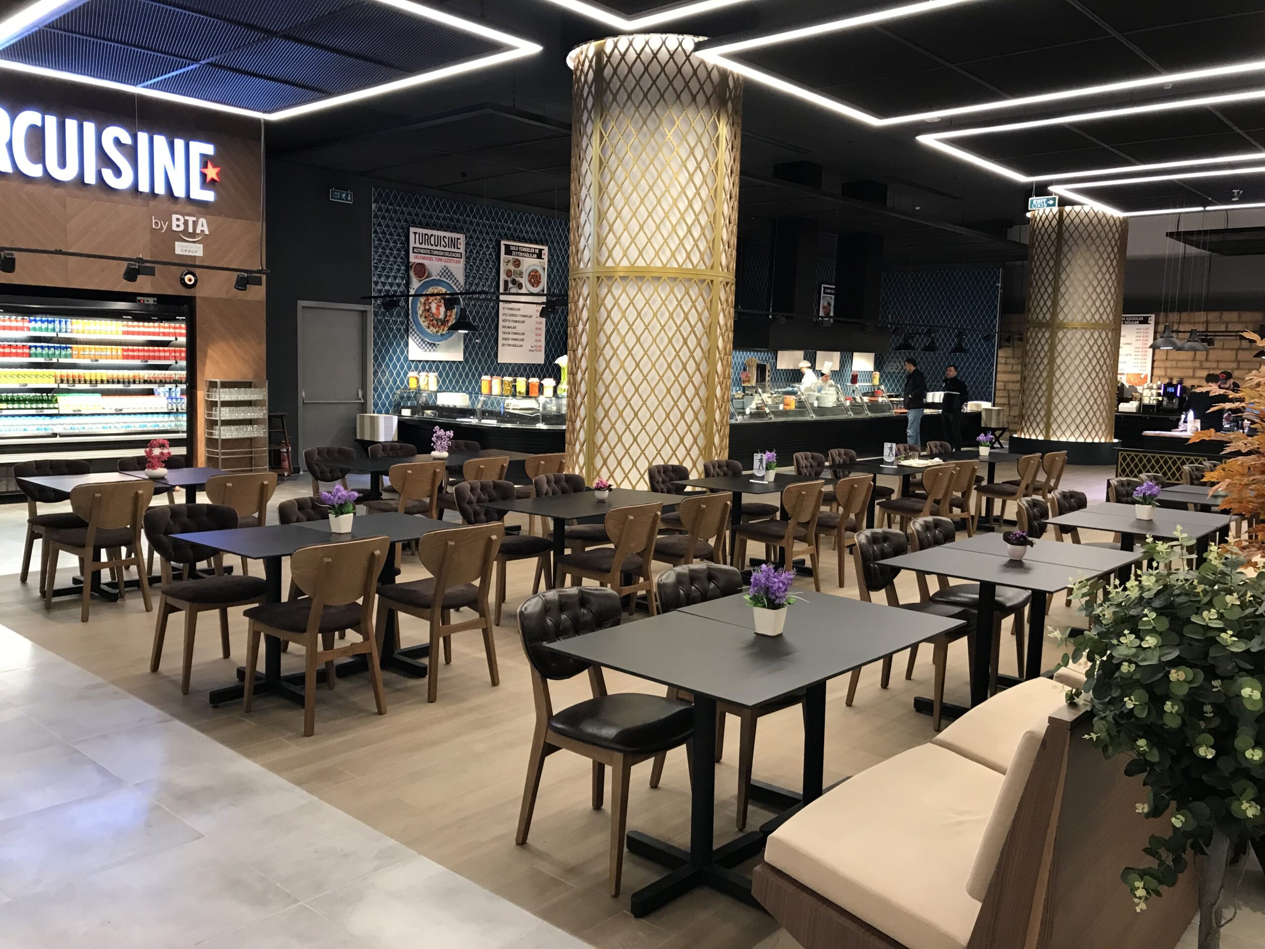 2018 yılında İstanbul Havalimanı’nda uygulamasını yaptığımız geleneksel Türk mimarisinden ilham alınarak tasarlanan Turcuisine, havalimanının giriş terminalindeki asma katta yer alıyor. İşlemeli kolon kaplamaları, ahşap duvar uygulamaları, tavan panelleri ve yemek bankosu mekanın ana tasarım ögeleri.